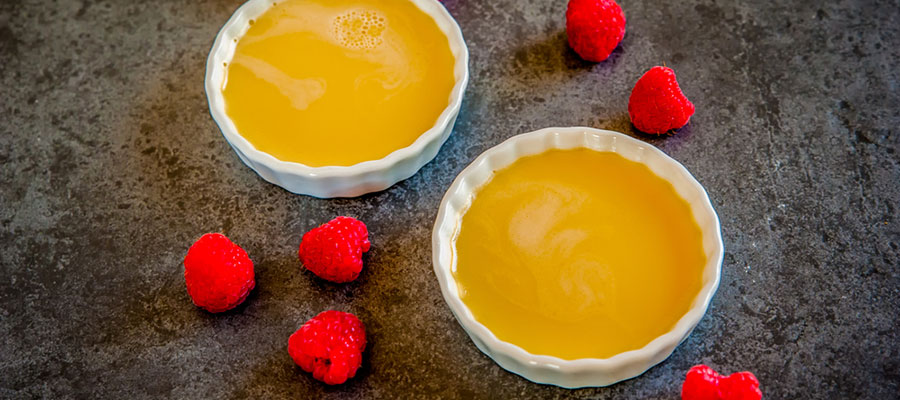 Hypersimple : on fait prendre dans un poêlon le jus de mangue et la crème avec de la gélatine végétale (agar-agar) et du sucre. C’est cuit en quelques minutes.