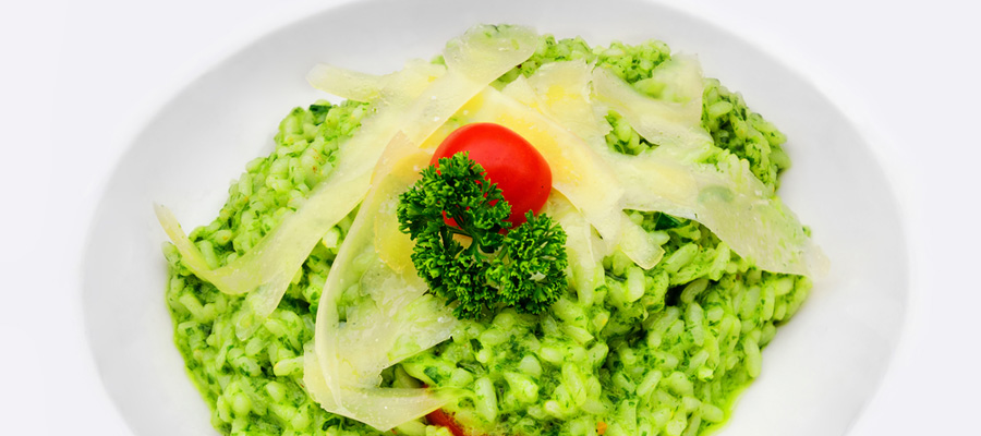 Faut-il encore présenter le Risotto ? Du riz rond cuit dans du bouillon maison avec des légumes est servi avec plein de bon beurre de ferme et un peu de Parmesan.